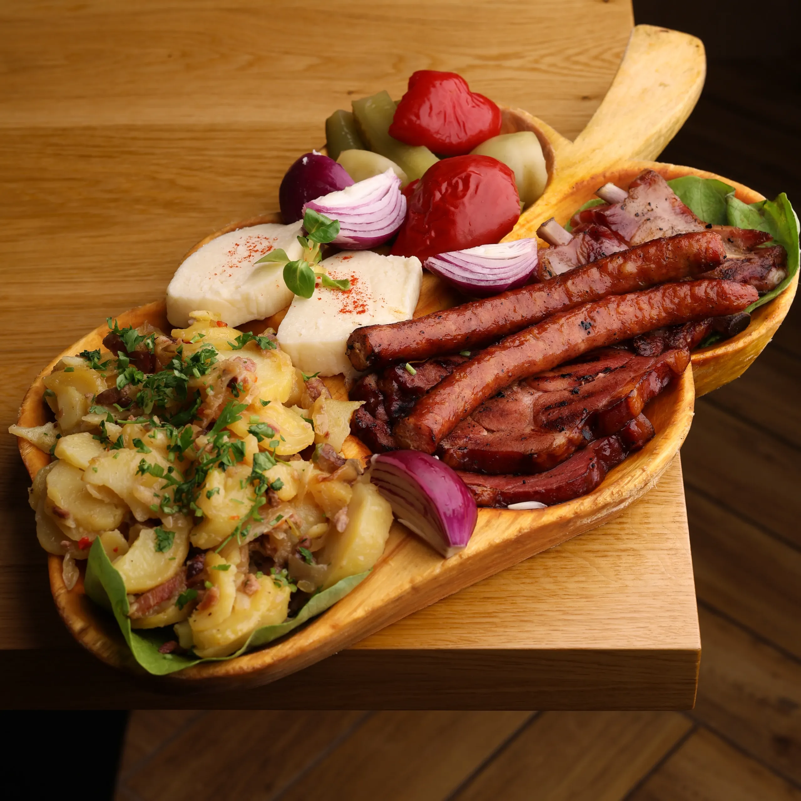 🥩Ingrediente: ceafă afumată, cârnaţi, coaste , brânză de burduf, ceapă, salată, garni