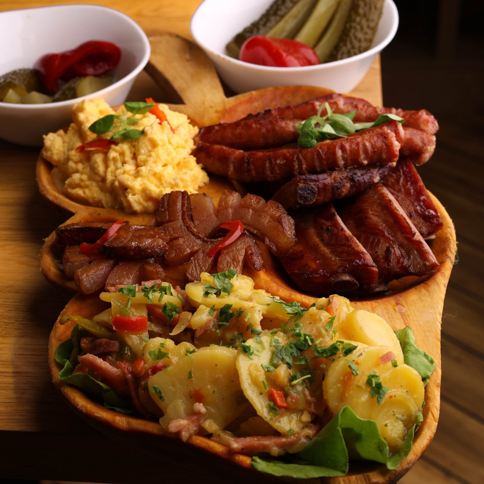 Ingrediente: omletă cu brânză de burduf, coaste, cârnați, păstramă, slănină, mămăligă și murături de casă.